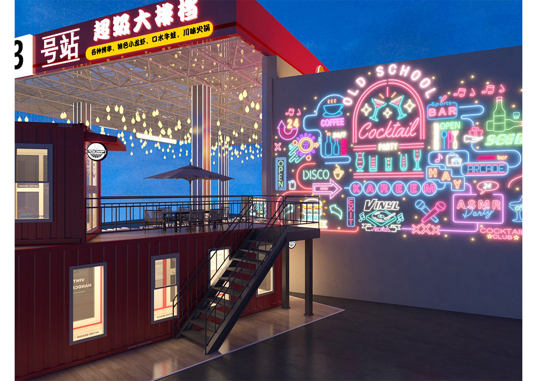 設計理念: 集裝箱大排檔裝修效果圖展現出了各種元素相互碰撞從而打造出完美融合。在總體布局上來說采用了集裝箱的利用和加油站的輪廓,再經過精美的裝飾,該濟南店面裝修能激發了顧客們的消費興趣與獨特的審美觀點。在墻面上掛上每家小吃的精美照片,為大排檔吸引來更多的人群。