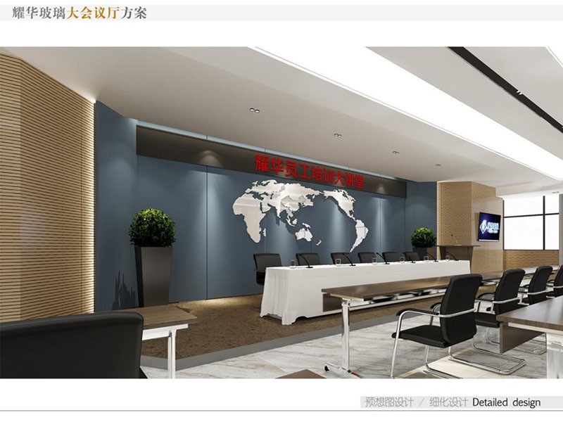設計理念: 耀華玻璃大堂裝修效果彰顯出企業的大氣與現代感。在大堂內樹立起一個耀華的標志性展示,巧妙展示了耀華玻璃的工藝精髓。墻面與地面材質選擇考究,與玻璃元素相得益彰,整體色調和諧統一,既展現了企業的專業形象,又營造出賓至如歸的溫馨氛圍。