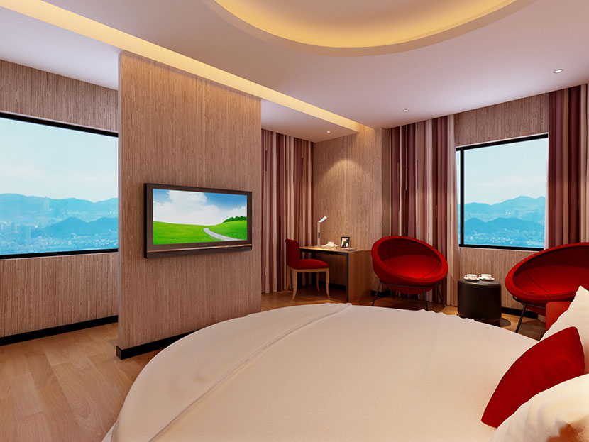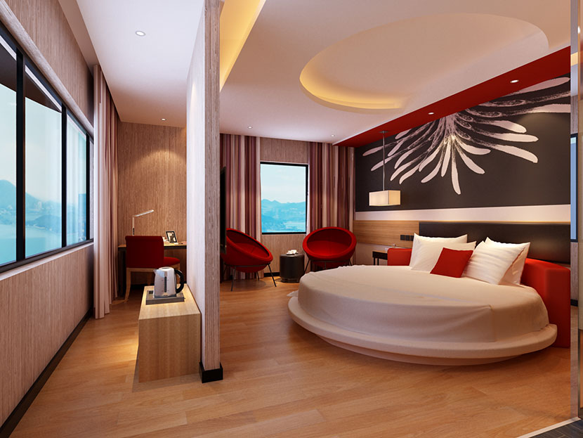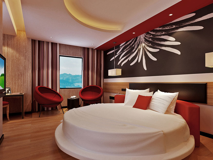 設計理念: 圓床房裝修效果獨特而浪漫,以圓形為主題設計。床頭背景墻采用柔和的色調與溫馨材質,利用鮮艷的紅色搭配軟包,圓形的床架搭配舒適的床墊與抱枕,不僅視覺上新穎別致,更提供了全方位的舒適體驗。房間內燈光設計柔和,通過壁燈、臺燈以及可調光的主燈,營造出浪漫溫馨的氛圍,讓情侶們共度美好時光。整體裝飾簡潔而不失精致,每一處細節都透露著對浪漫與舒適的追求。